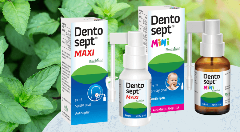 Pentru menținerea sănătății gingiilor și a integrității mucoasei orale, PlantExtrakt a lansat gama de spray-uri Dentosept, dedicată atât adulților (Dentosept MAXI), cât și prichindeilor din viața ta (Dentosept MINI). Produsele sunt recomandate în caz de gingii inflamate, când ne confruntăm cu sângerare gingivală, în caz de afte, când apar mici răni provocate de utilizarea aparatului dentar, sau a protezei dentare. În cazul sugarilor, Dentosept MINI acționează în câteva minute pentru calmarea durerii cauzată de erupția dentară și îi oferă bebelușului și mămicii lui circa 4 ore de efect analgezic, numai bun pentru un somn odihnitor.