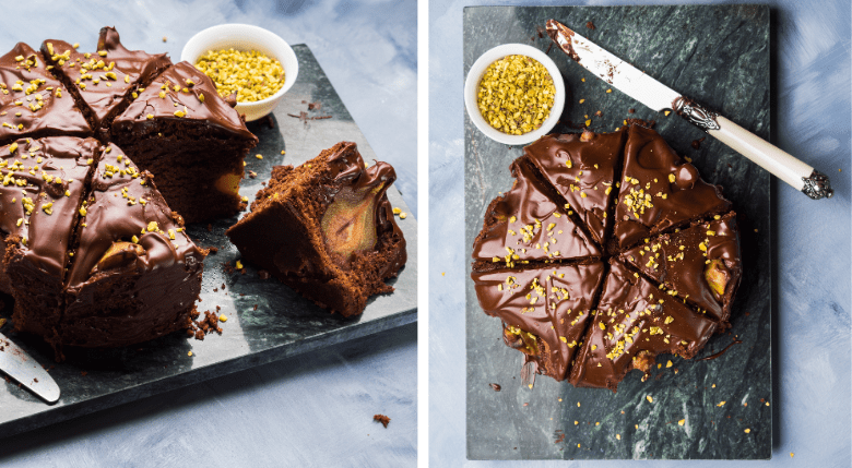 - https://www.gatherandfeast.com/pear-dark-chocolate-caramelised-pecan-cake