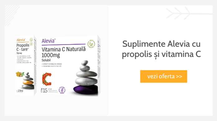 Gamele Alevia Propolis și Vitamina C acoperă un spectru larg de produse care stimulează sistemul imunitar și ajută organismul să lupte cu răceala, gripa și dureri în gât. Acestea au diverse moduri de administrare: Vitamina C Naturală 1000mg din extract de măceșe – 15 plicuri cu pulbere solubilă, Propolis C-tare Spray fără alcool pentru adulți și copii în a cărui compoziție, pe lângă cele 2 ingrediente, se regăsesc și uleiuri esențiale de ghimbir, salvie, anason și cuișoare, cât și comprimatele Propolis C-tare cu extracte standardizate de măceșe, salvie și rădăcină de ghimbir.