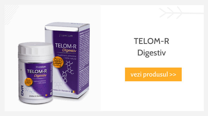 4. Nu uita să apelezi la metode specializate și soluții verificate, cum ar fi administrarea suplimentului Telom-R Digestiv. În timpul cercetărilor s-a ajuns la concluzia că Telom-R Digestiv contribuie la refacerea funcției digestive afectate de alimentația nesănătoasă, stresul psihic și afecțiunile virale sau bacteriene, iar acest lucru se datorează extractelor de plante naturale amare, ce susțin secreția normală de sucuri digestive și enzime.